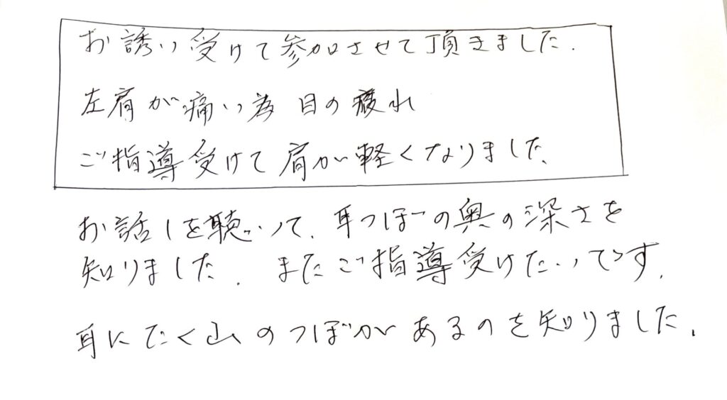 つぼ押しの効果は3日〜5日程度になります。セルフ施術もご案内いたしております。