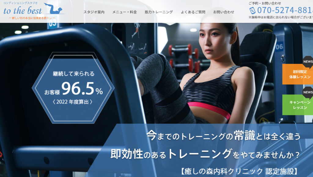 コンディショニングスタジオ to the bestは筋肥大だけを目的としたトレーニングではなく、実用的で必要な筋肉を鍛えるアンチエイジングトレーニングを行うジムです。