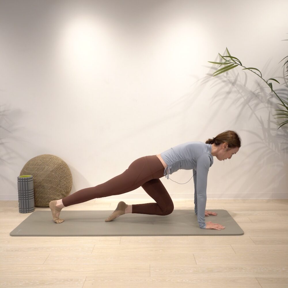 膝立ちのランジポーズで股関節周りをストレッチ。下半身の柔軟性を高め、姿勢改善にも効果的です。