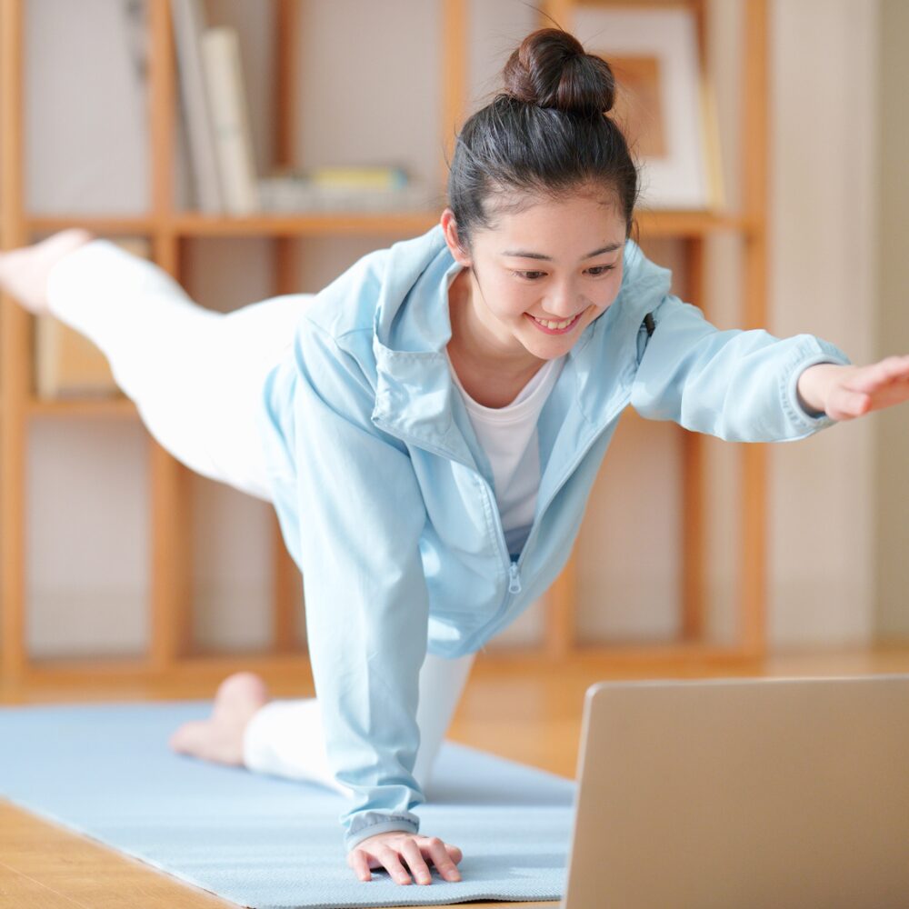 オンラインレッスンを受けながら自宅でピラティス。パソコンの画面を見ながらインストラクターの指導に合わせてトレーニングできます。